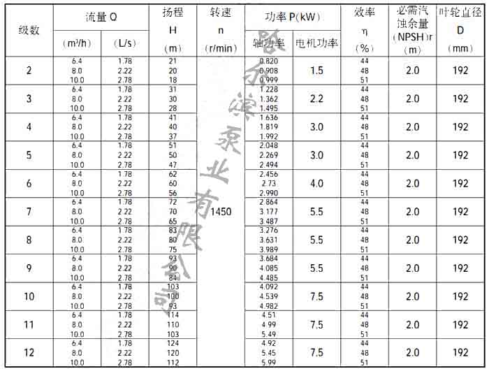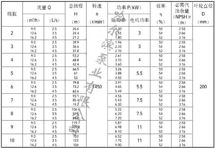 50DL型泵性能參數表